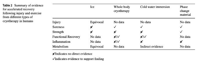 Kwiecien, S.Y. and McHugh, M.P., 2021. The cold truth: the role of cryotherapy in the treatment of injury and recovery from exercise. European journal of applied physiology, 121(8), pp.2125-2142.